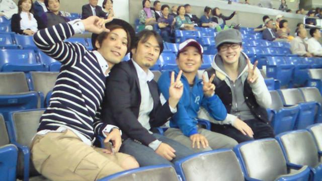 左から、松尾さん(ザブングルの目立たない方)中嶋Pさん(めちゃいけプロデューサーさん、西武ファン)田中さん(巨人ファンなのに何故か西武色の洋服)の4人でした。